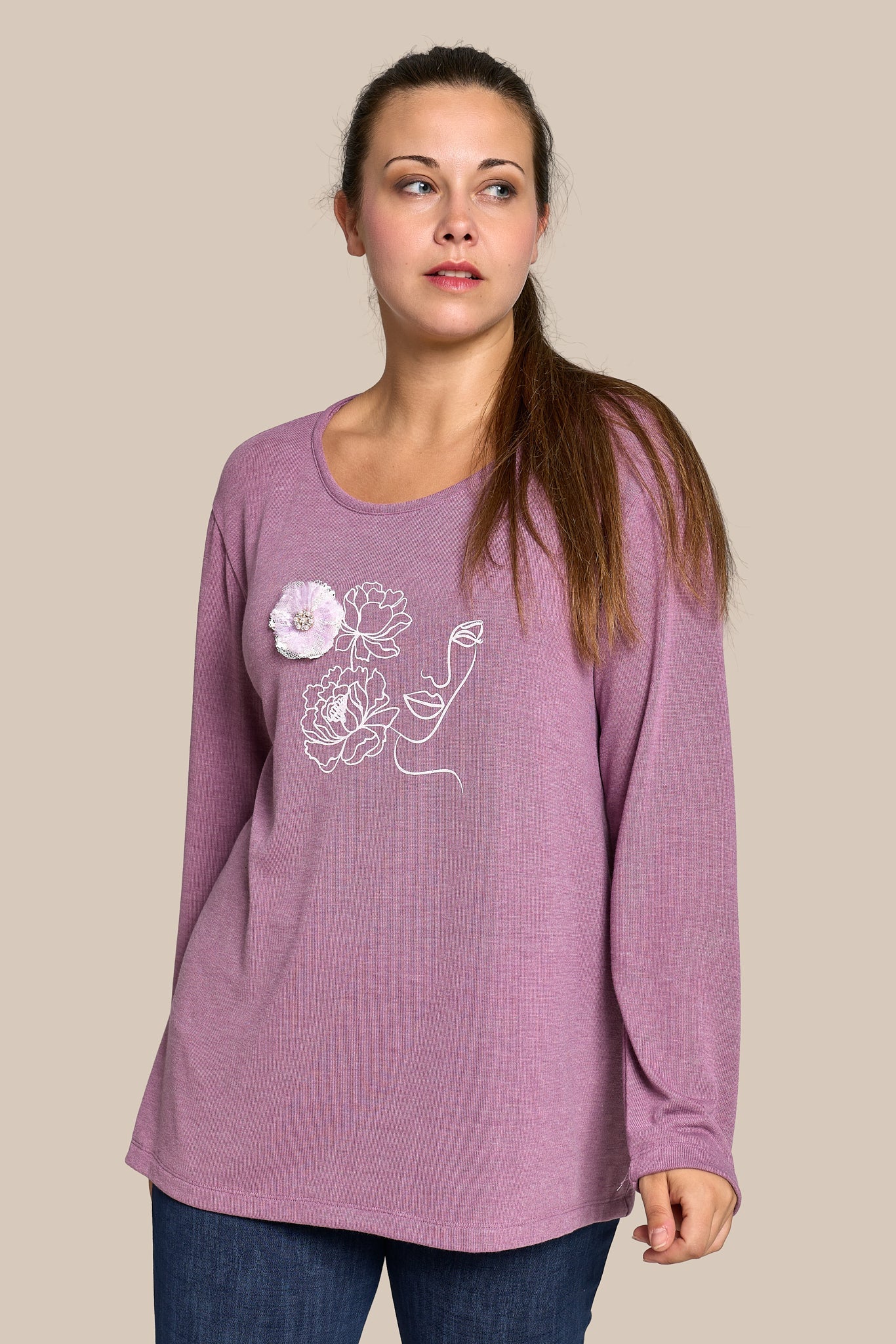 Túnica escote redondo con estampado lÍnea y flor aplicada. 77% Poliéster 19% Viscosa 4% Elastán
